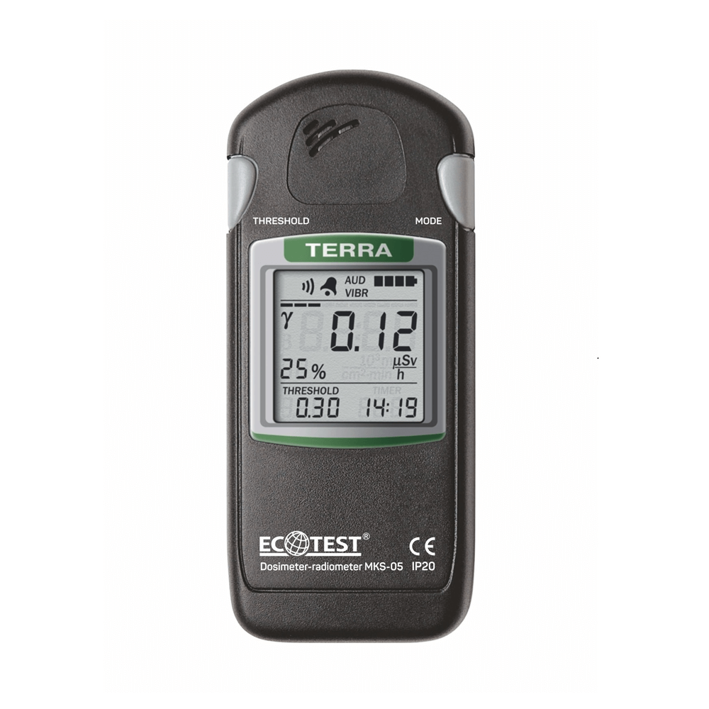 TERRA is a professional device for official measurements, which measures the level of gamma background, beta contamination, accumulated dose, and its accumulation time.